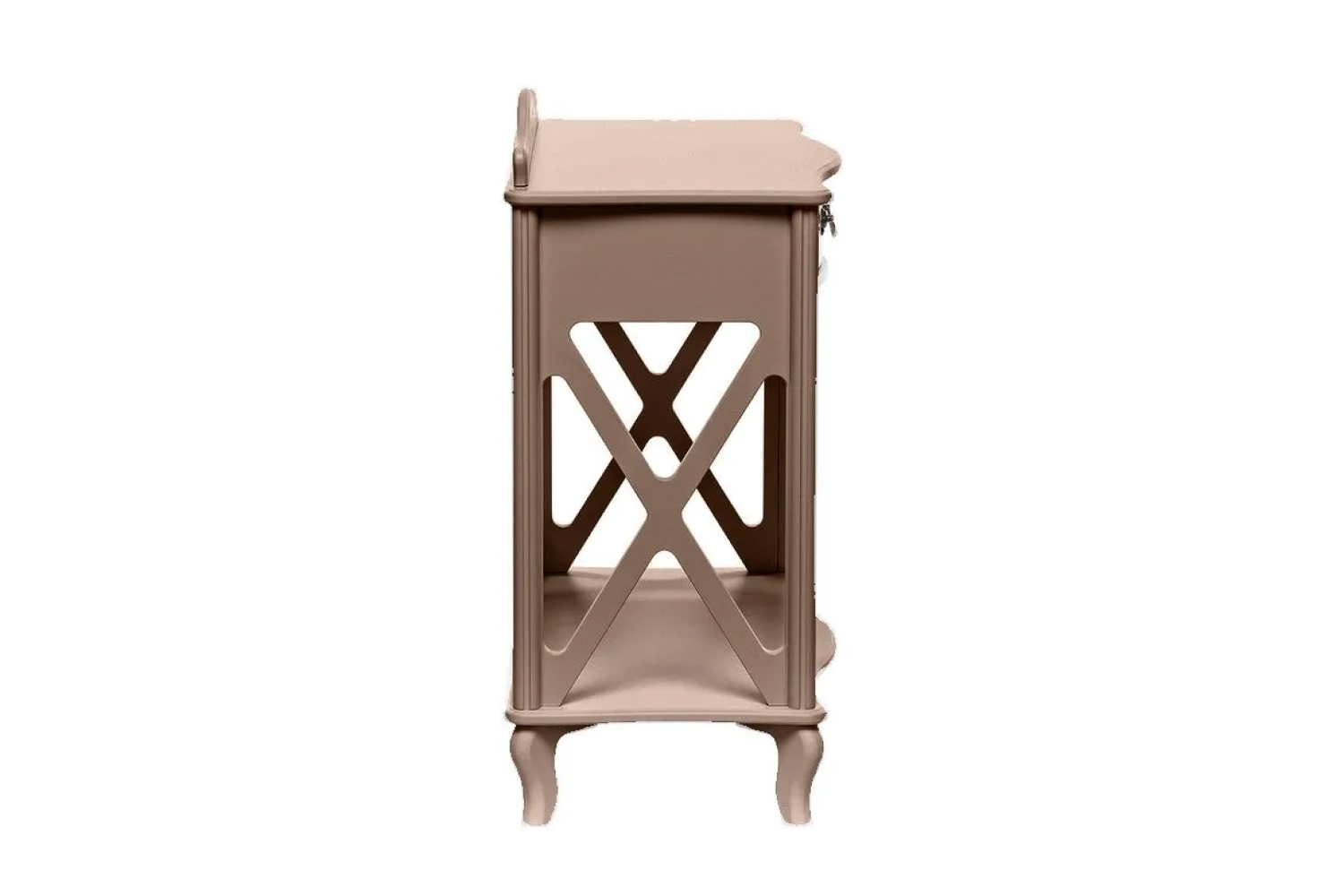 Узкий консольный столик «Джульетта» в цвете мокко предназначен для декоративных целей — на небольшую поверхность можно поместить вазу, сувенир, необычную статуэтку. Внешний вид изделия соответствует интерьерному стилю прованс. Бежевый оттенок, фигурная форма, изогнутые ножки, фурнитура в цвете «античная бронза» превосходно впишутся и в классическую обстановку. Основание модели выполнено из МДФ, боковины и столешница — из ЛМДФ, прочие детали изготовлены из шпона натурального ясеня. Изюминка консоли — боковые части в виде декоративных элементов фахверков. В компактном ящике с бесшумным механизмом выдвижения можно хранить любимые книги, косметику, украшения, очки, различные мелочи.